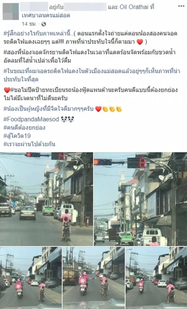 เรียกได้ว่าเป็นเรื่องราวที่มีคนต่างเข้ามาแสดงความคิดเห็นกันเป็นจำนวนมาก เมื่อผู้ใช้เฟซบุ๊กรายหนึ่งโพสต์เล่าเหตุการณ์ขณะขับรถไปติดไฟแดง ในตัวเมือง แม่สอด จ.ตาก แล้วเจอ 2 หนูน้อยปั่นจักรยานจอดอยู่ ตอนแรกตั้งใจถ่ายแค่น้องสองคนเพราะความเอ็นดู แต่หลังจากนั้นกลับเจอเรื่องประทับใจตามมา เมื่อสาวฟู้ดแพนด้าขับรถผ่านมาเห็น ได้ยื่นขนมให้เด็กๆทั้งสองไปทานเล่น ก่อนขับรถออกไปโดยไม่หวังสิ่งตอบแทน หรือคำชื่นชมจากใครใดๆทั้งสิ้น