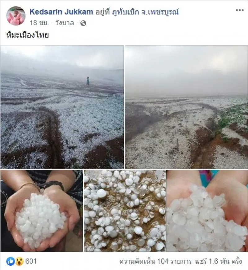 ล่าสุดได้มีผู้ใช้เฟซบุ๊ค Kedsarin Jukkam ได้โพสต์ ภาพของ พื้นที่บนยอดเขาภูทับเบิกที่ถูกปกคลุมไปด้วย ลูกเห็บที่กำลังขาวโพลนทุกพื้นที่ พร้อมระบุข้อความว่า
