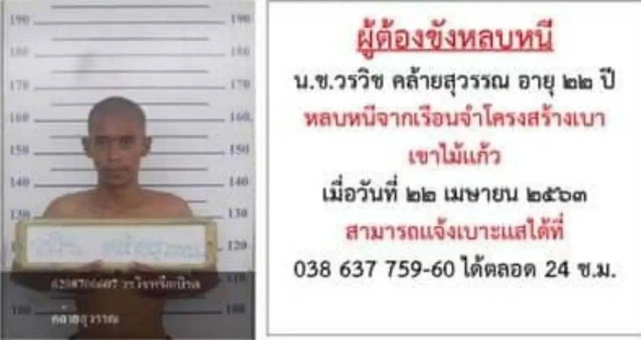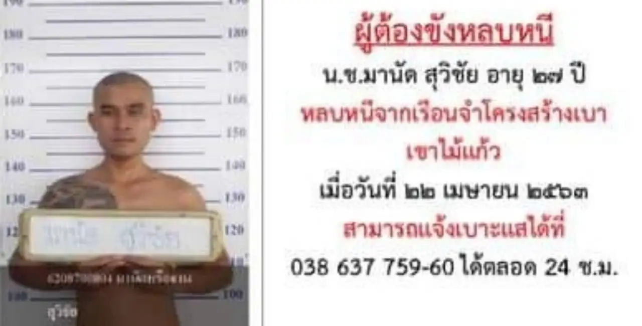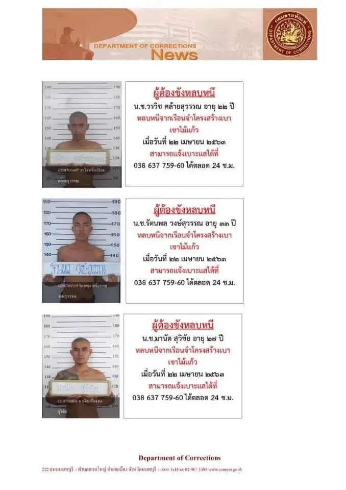 หรือให้ที่พักอาศัยจะต้องถูกดำเนินคดีตามกฎหมายด้วยเช่นกันจึงขอความร่วมมือจากญาติและบุคคลใกล้ชิดของผู้ต้องขังเกลี้ยกล่อมขอให้เข้ามอบตัว และหากผู้ใดพบเห็นสามารถแจ้งเบาะแสได้ที่เรือนจำโครงสร้างเบาเขาไม้แก้ว หมายเลขโทรศัพท์ 038 637 759-60 ได้ตลอด 24 ช.ม.