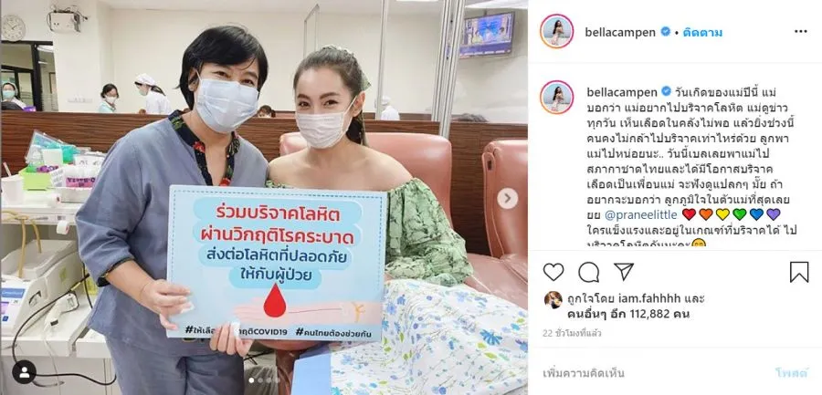 "วันเกิดของแม่ปีนี้ แม่บอกว่า แม่อยากไปบริจาคโลหิต แม่ดูข่าวทุกวัน เห็นเลือดในคลังไม่พอ แล้วยิ่งช่วงนี้คนคงไม่กล้าไปบริจาคเท่าไหร่ด้วย ลูกพาแม่ไปหน่อยนะ.. วันนี้เบลเลยพาแม่ไปสภากาชาดไทยและได้มีโอกาสบริจาคเลือดเป็นเพื่อนแม่ จะฟังดูแปลกๆ มั๊ย ถ้าอยากจะบอกว่า ลูกภูมิใจในตัวแม่ที่สุดเลยยย @praneelittle ใครแข็งแรงและอยู่ในเกณฑ์ที่บริจาคได้ ไปบริจาคโลหิตกันนะ"