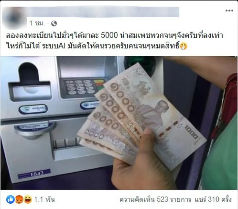 ลองลงทะเบียนไปมั่วๆได้มาละ 5000 น่าสงสารพวกจนๆจังครับที่ลงเท่าไหร่ก็ไม่ได้ ระบบAI มันคัดให้คนครับคนจนๆหมดสิทธิ์