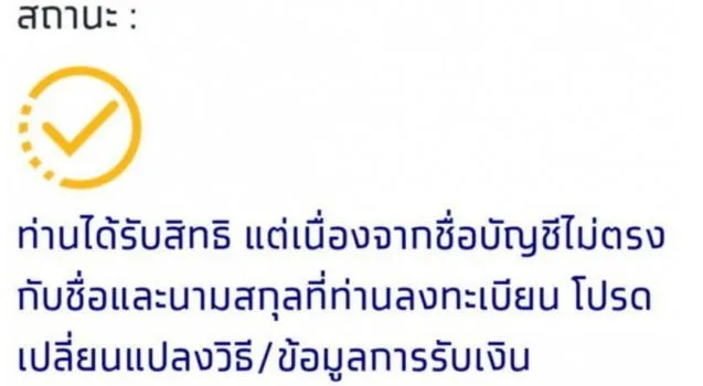 สถานะ ท่านได้รับสิทธิ แต่เนื่องจากชื่อบัญชีไม่ตรงกับชื่อและนามสกุลที่ท่านลงทะเบียน โปรดเปลี่ยนแปลงวิธี/ ข้อมูลการรับเงิน ความหมาย ได้รับสิทธิ์ แต่ให้เข้าไป เปลี่ยนแปลงข้อมูลการรับเงิน ด้วยการผูกบัญชีพร้อมเพย์กับเลขบัตรประชาชน ผ่าน Mobile Banking หรือ ตู้ ATM