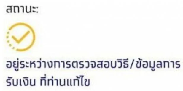 สถานะ อยู่ระหว่างการตรวจสอบวิธี ข้อมูลการรับเงินที่ท่านแก้ไข ความหมาย ระบบกำลังตรวจสอบข้อมูลการรับเงินว่าถูกต้องก่อนทำการโอนเงินเข้าบัญชี