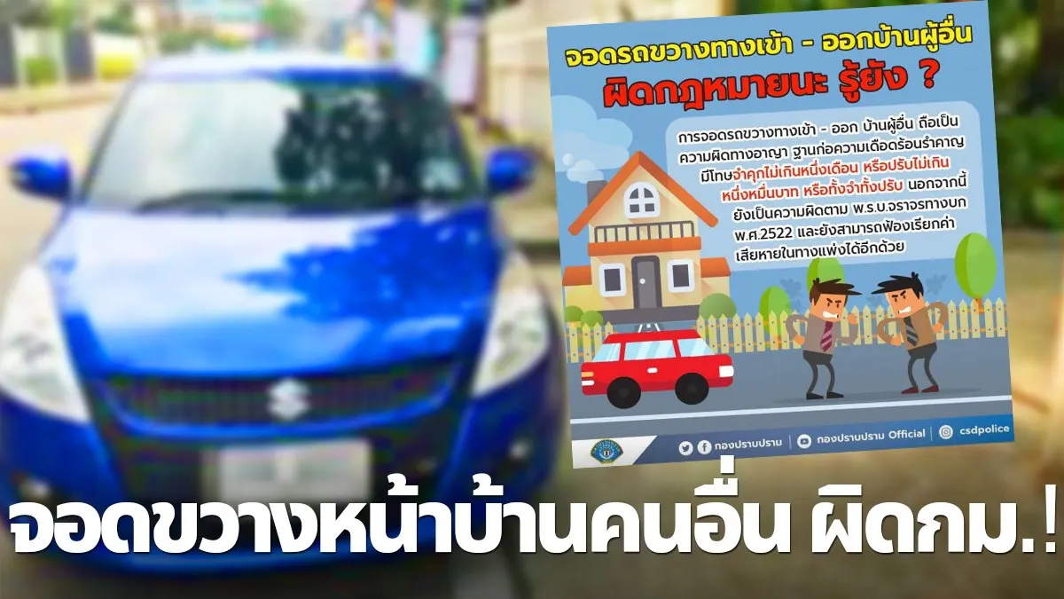 กองปราบ เตือนจอดรถขวางทางเข้า-ออกบ้านผู้อื่น ผิดกฎหมาย