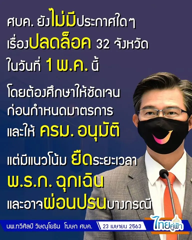 วานนี้ (23 เม.ย. 63) เพจ ไทยคู่ฟ้า เผย ยังไม่ประกาศปลดล็อก 32 จังหวัดระบุว่า นพ.ทวีศิลป์ วิษณุโยธิน โฆษก ศบค. ปฏิเสธกรณีข่าวปลดล็อก 32 จังหวัด ในวันที่ 1 พ.ค. 63 ว่า ขณะนี้ ศบค. ยังไม่มีการประกาศใดๆ ศบค. จะต้องมีการประชุมศึกษาให้ชัดเจนก่อนกำหนดมาตรการต่างๆ และให้คณะรัฐมนตรีอนุมัติ