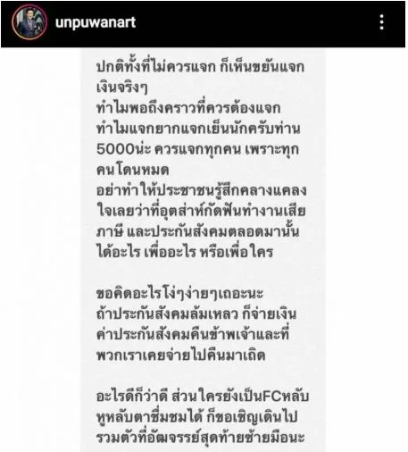 24 เม ย 63 อั๋น ภูวนาท คุนผลิน พิธีกร ดีเจ และนักร้องชื่อดัง ได้โพสต์ภาพผ่านอินสตาแกรมส่วนตัว unpuwanart กล่าวถึงการแจกเงิน 5000 บาท ของทางรัฐบาล รวมถึงเงินประกันสังคม ที่กำลังเป็นประเด็นร้อนแรง เนื่องจากประชาชนจำนวนมาก ได้รับผลกระทบทางความเป็นอยู่ เนื่องจาก cd 19 กำลังระบาด