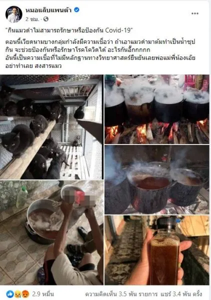 วันนี้ ( 24 เมษายน 2563 ) ในเฟซบุ๊กแฟนเพจ หมอแล็บแพนด้า ได้โพสต์เตือน กินแมวดำไม่สามารถรักษาหรือป้องกัน Covid-19 โดยระบุข้อความว่า “ตอนนี้เวียดนามบางกลุ่มกำลังมีความเชื่อว่า ถ้าเอาแมวดำมาต้มทำเป็นน้ำซุปกิน จะช่วยป้องกันหรือรักษาโรคโควิดได้ อะไรกันอี๊กกกกก อันนี้เป็นความเชื่อที่ไม่มีหลักฐานทางวิทยาศาสตร์ยืนยันเลยพ่อแม่พี่น้องเอ๊ย อย่าทำเลย สงสารแมว”
