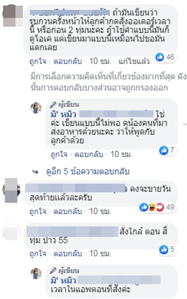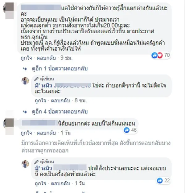 และยังมีชาวเน็ตอีกหลายคนเข้ามาแสดงความคิดเห็นเช่น ร้านควรใช้คำที่สุภาพมากกว่านี้ ส่วนอีกคนแสดงความเห็นว่า “แค่ใช้คำต่างกันก็ให้ความรู้สึกแตกต่างกันแล้วนะคะ อาจจะเขียนแนบ เป็นโน้ตมาก็ได้ ประมาณว่าแจ้งคุณลูกค้า รบกวนสั่งอาหารไม่ เกิน20.00นะคะ เนื่องจาก ทางร้านปรับเวลาปิดรับออเดอร์เร็วขึ้น ตามประกาศ พรก.ฉุกเฉิน ประมาณนี้ ลูกค้าก็รู้เรื่องแล้วไหม ถ้าพูดแบบนั้นเหมือนไม่แคร์ลูกค้าเลย ทั้งๆที่เขาเอาเงินไปให้”