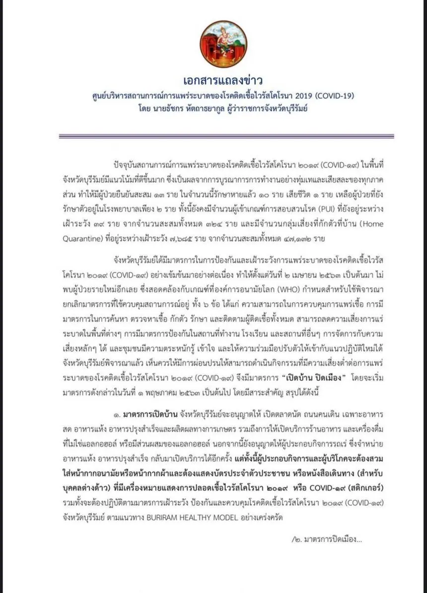 เริ่มตั้งแต่วันที่ 1 พ.ค. เป็นต้นไป บุคคลที่อาศัยอยู่ในจังหวัดบุรีรัมย์เกิน 14 วัน (โดยไม่มีประวัติเดินทางออกไปต่างจังหวัดใดๆ ทั้งสิ้น ในระยะเวลา 14 วันนี้) หรือผู้ที่มีใบยืนยันจากห้องตรวจเชื้อว่าพ้นระยะติดต่อของโรคแล้ว ต้องติดสติ๊กเกอร์ Buriram Healthy ที่บัตรประจำตัวประชาชน