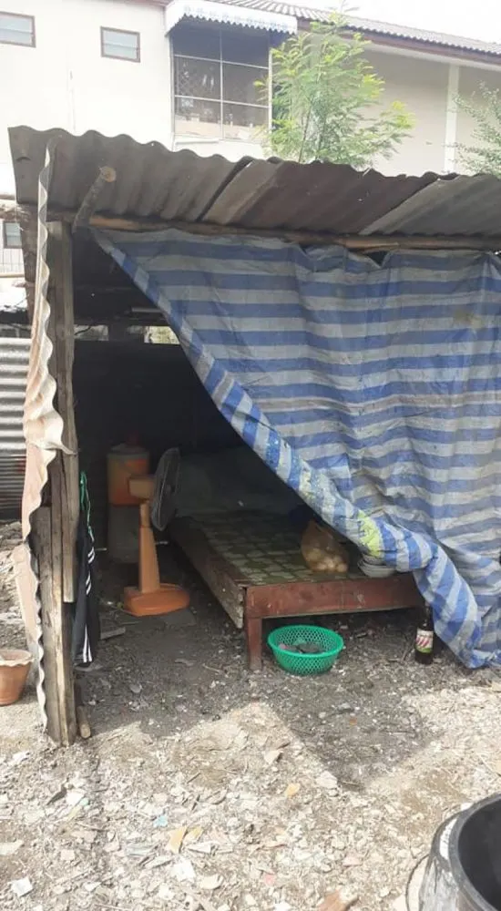 ที่อยู่ของลุงเป็นเพิงเล็กๆ ถ้าพูดไปแล้ว เพิงที่ลุงอยู่เล็กกว่าห้องน้ำของบ้านบางหลังซะอีก พื้นก็เป็นดินธรรมดา มีสังกะสีล้อม มีโต๊ะไว้สำหรับนอน มีหม้อหุงข้าวที่เขาให้ยืมมา แต่กับข้าวน้องสาวทำมาให้