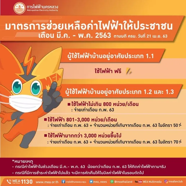 ตามที่ คณะรัฐมนตรี (ครม.) มีมติรับทราบแนวทางการดำเนินการมาตรการช่วยเหลือผู้ใช้ไฟฟ้าที่ได้รับผลกระทบจากสถานการณ์การระบาดของโรคติดเชื้อไวรัสโคโรนา 2019 (COVID-19) เพิ่มเติม ตามที่กระทรวงพลังงาน (พน.) เสนอเมื่อวันที่ 21 เมษายน 2563 นั้น การไฟฟ้านครหลวง หรือ MEA รัฐวิสาหกิจสังกัดกระทรวงมหาดไทย ซึ่งมีหน้าที่รับผิดชอบระบบจำหน่ายไฟฟ้าในพื้นที่กรุงเทพมหานคร นนทบุรี และสมุทรปราการ พร้อมตอบสนองนโยบายรัฐบาล โดยการดำเนินมาตรการดังกล่าวจะเป็นการช่วยเหลือและบรรเทาความเดือดร้อนให้กับผู้ใช้ไฟฟ้าประเภทบ้านอยู่อาศัย จำนวนประมาณ 22 ล้านราย เป็นวงเงินประมาณ 23,668 ล้านบาท (ไม่รวมภาษีมูลค่าเพิ่ม) มีรายละเอียด ดังนี้