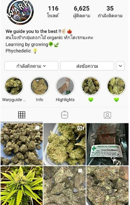 มีพฤติกรรมเปิด INSTRAGRAM ใช้ชื่อว่าwarpguide โพสต์จำหน่ายกัญชาสายพันธุ์จากต่างประเทศ จัดส่งให้ลูกค้าทางพัสดุ