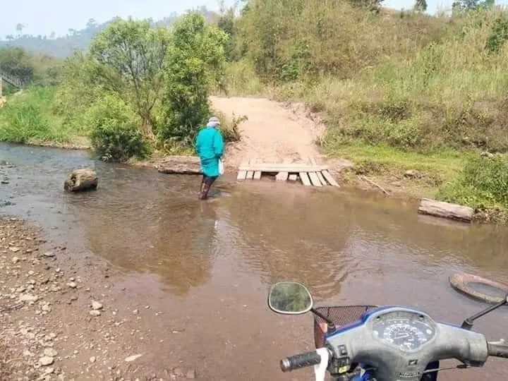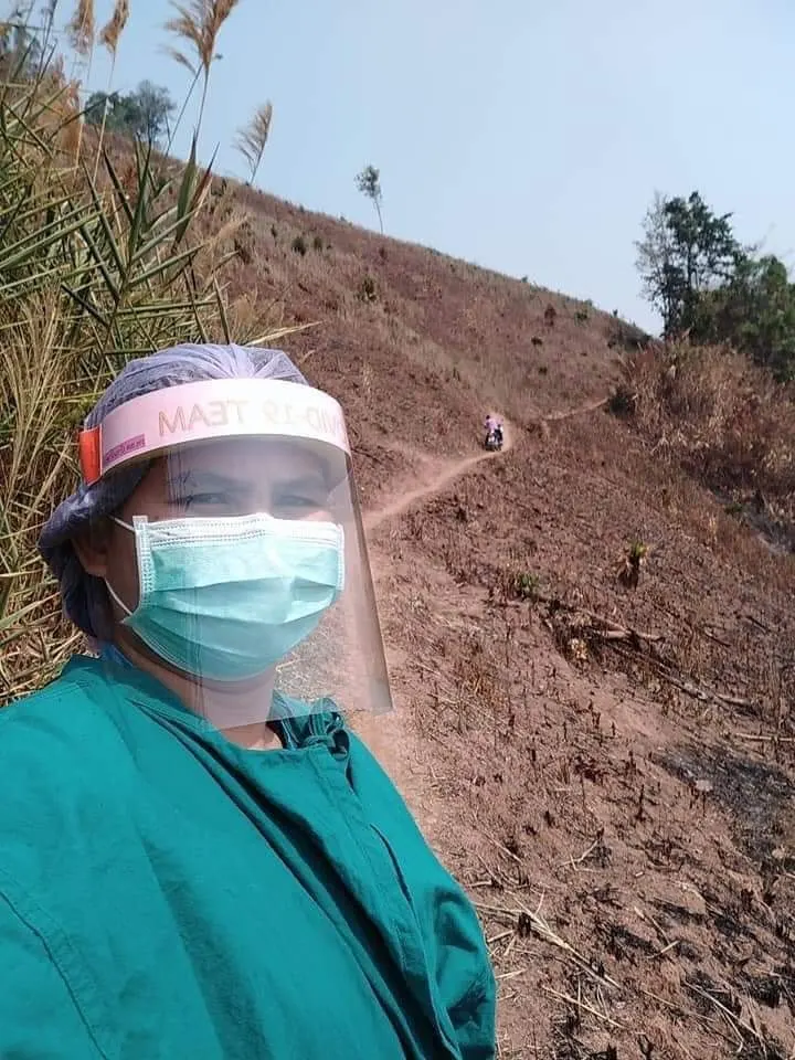 เส้นทางจาก รพ.สต.ไปยังสถานที่กักตัว เริ่มจากถนนค่อนข้างสะดวกสบาย เข้าสู่ถนนลูกรัง ความยากลำบากเพิ่มขึ้นเรื่อยๆ บางช่วงเป็นเส้นทางที่แคบและเขาสูงชัน บางช่วงมีลำห้วยขวางกั้นเส้นทาง ต้องเดินเท้าสลับกับนั่งซ้อนท้ายจักรยานยนต์หลายรอบ ข้าพเจ้าเหงื่อท่วมตัวภายใต้ชุดประยุกต์ ที่ปิดมิดชิด หายใจภายใต้หน้ากากอนามัยที่ชุ่มด้วยเหงื่อ ช่างเป็นช่วงเวลาที่ยาวนาน คำว่า “เหนื่อยสายตัวแทบขาด” คงเป็นแบบนี้เอง
