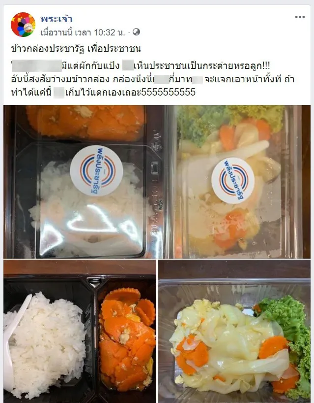 กลายเป็นดราม่าขึ้นมาทันทีหลังจากที่พรรคพลังประชารัฐได้นำข้าวกล่องและน้ำดื่มมาแจกแก่ชาวบ้าน ซึ่งเมื่อวันที่ 23 เมษายน 2563 จากเพจพระเจ้า ได้นำภาพข้าวกล่องที่พรรคพลังประชารัฐได้นำมาแจกจ่ายให้กับชาวบ้าน โดยกำลังถูกวิพากษ์วิจารณ์อย่างมากในโลกออนไลน์ พร้อมกับข้อความระบุว่า “ข้าวกล่องประชารัฐ เพื่อประชาชน มีแต่ผักกับแป้ง เห็นประชาชนเป็นกระต่ายหรือถ้าทำได้แค่นี้ เก็บไว้กินเอง พร้อมวิจารณ์ถึงงบประมาณในการทำข้าวกล่องว่าใช้เงินกี่บาท ซึ่งได้มีการวิพากษ์วิจารณ์และแชร์ต่อกันในโลกออนไลน์อย่างมาก