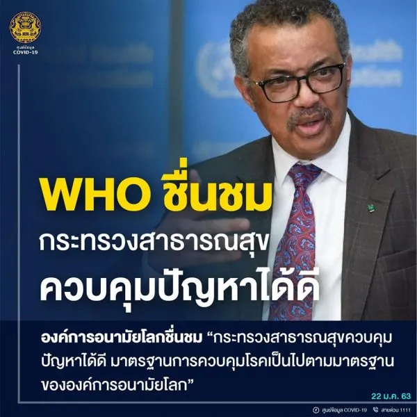 - องค์การอนามัยโลก หรือ WHO ชื่นชมกระทรวงสาธารณสุขของไทยสามารถควบคุมปัญหาได้ดี และเป็นไปตามมาตรฐานขององค์การอนามัยโลก