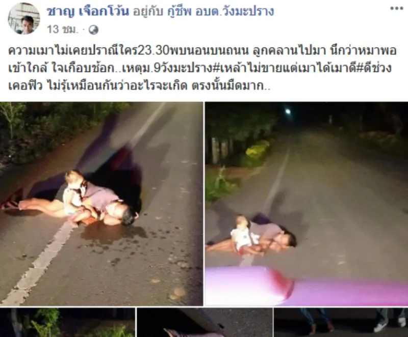 เป็นอีกหนึ่งเหตุการณ์ ที่ถูกวิพากษ์วิจารณ์อย่างมากในโลกออนไลน์ เมื่อกลางดึกที่ผ่านมา ผู้ใช้เฟซบุ๊กชื่อว่า ชาญ เจือกโว้น ซึ่งเป็น จนท อบต วังมะปราง ได้มีการโพสต์ภาพ หญิงรายหนึ่ง ที่นอนอยู่ข้างถนนพร้อมกับลูกน้อยที่คลานไปมา ทำเอาผู้โพสต์ถึงกับตกใจ เนื่องจากในขณะนั้นกำลังขับรถอยู่ ก่อนที่จะมาเจอหญิงรายนี้กับลูกที่ข้างทาง