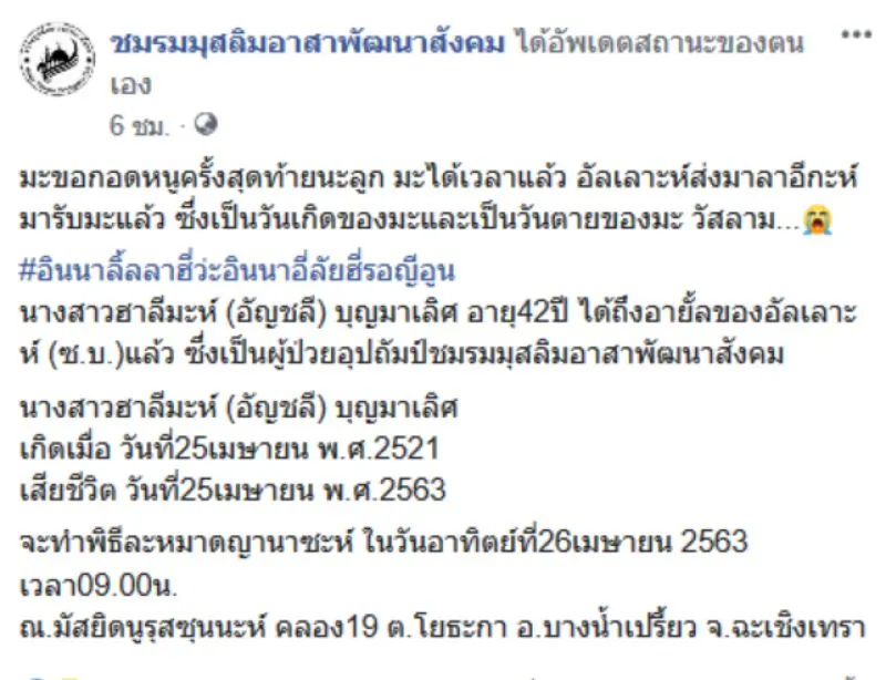 อินนาลิ้ลลาฮี่ว่ะอินนาอี่ลัยฮี่รอญีอูน นางสาวฮาลีมะห์ (อัญชลี) บุญมาเลิศ อายุ42ปี ได้ถึงอายั้ลของอัลเลาะห์ (ซ.บ.)แล้ว ซึ่งเป็นผู้ป่วยอุปถัมป์ชมรมมุสลิมอาสาพัฒนาสังคม
