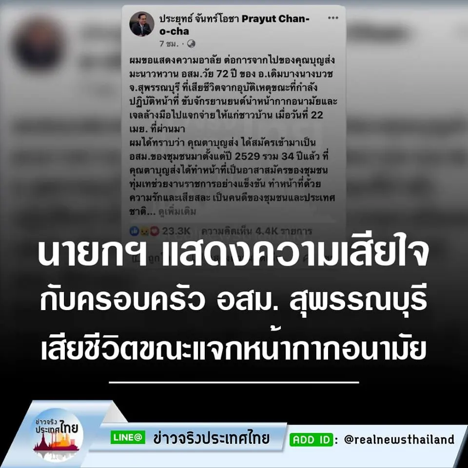 นายกฯ แสดงความเสียใจกับครอบครัว อสม. สุพรรณบุรี เสียชีวิตขณะแจกหน้ากากอนามัย