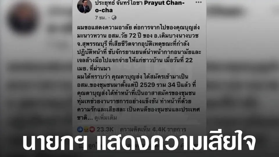 พลเอก ประยุทธ์ จันทร์โอชา นายกรัฐมนตรีและรัฐมนตรีว่าการกระทรวงกลาโหมโพสต์ข้อความผ่าน Facebook Prayut Chan-o-cha มีข้อความว่า “ผมขอแสดงความอาลัย ต่อการจากไปของคุณบุญส่ง มะนาวหวาน อสม.วัย 72 ปี ของ อ.เดิมบางนางบวช จ.สุพรรณบุรี ที่เสียชีวิตจากอุบัติเหตุขณะที่กำลังปฏิบัติหน้าที่ ขับจักรยานยนต์นำหน้ากากอนามัยและเจลล้างมือไปแจกจ่ายให้แก่ชาวบ้าน เมื่อวันที่ 22 เมย. ที่ผ่านมา”