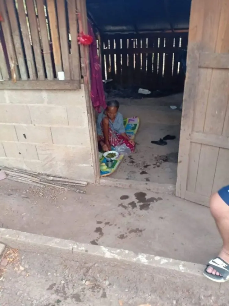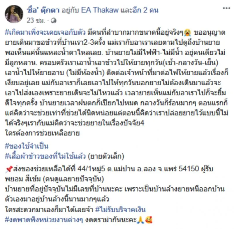 เรียกได้ว่าเป็นอีกหนึ่งเรื่องราว ที่น่าสงสารเป็นอย่างมาก เมื่อวันที่ 25 เมษายน ที่ผ่านมา ผู้ใช้เฟซบุ๊ก ชื่อ ตุ๊กตา ได้โพสต์เล่าว่า มีหญิงชราเดินมาขอข้าวที่บ้าน 2-3 ครั้ง ตนกับแม่ และ อา เลยตามไปดูถึงที่บ้าน พอไปเห็นที่บ้าน ถึงกับพูดไม่ออก เนื่องจากที่บ้านของหญิงชรารายนี้ ไม่มีไฟฟ้า ไม่มีน้ำ อยู่คนเดียวไม่มีบุตรหลาน ทางครอบครัวจึงช่วยเอาน้ำเอาข้าวไปให้หญิงชราทุกวัน เช้า กลางวัน เย็น เอาน้ำไปให้อาบ (ไม่มีห้องน้ำ) ติดต่อเจ้าหน้าที่มาต่อไฟให้แล้ว เรื่องก็เงียบอยู่เลย และได้บอกหญิงชราว่าไม่ต้องเดินมาแล้ว จะเอาไปส่งเองเพราะเดินจะไม่ไหวแล้ว เวลาที่หญิงชราเห็น ก็จะยิ้มดีใจทุกครั้ง บ้านหญิงชราเวลาฝนตกก็เปียกไปหมด กลางวันก็ร้อนมาก ๆ ตอนแรกก็แค่คิดว่าจะช่วยเท่าที่ช่วยได้นิดหน่อยแต่ตอนนี้คิดว่าเราปล่อยไว้แบบนี้ไม่ได้จริง ๆ