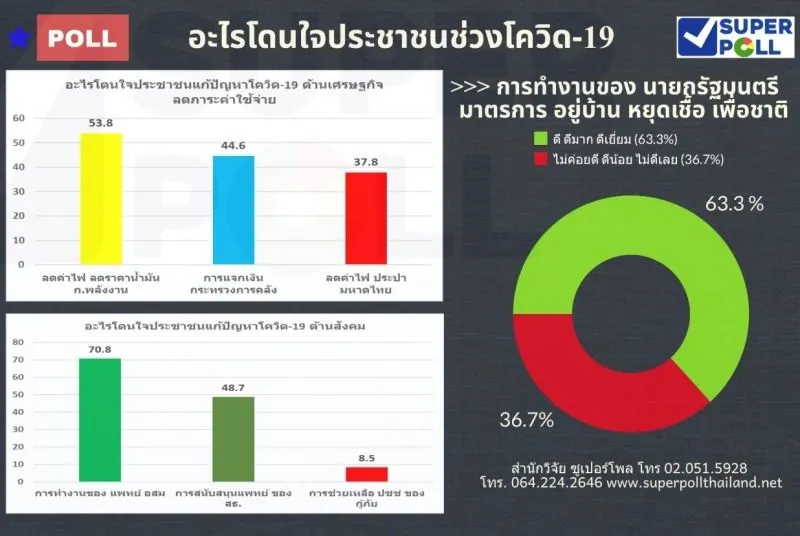 ผอ.ซูเปอร์โพล กล่าวว่า ผลโพลชิ้นนี้ชี้ให้เห็นว่า หลังรัฐบาลออกมาตรการ อยู่บ้าน หยุดเชื้อ เพื่อชาตินั้น ประชาชนส่วนใหญ่รับรู้การทำงานของรัฐบาล นำโดยนายกรัฐมนตรี พล.อ.ประยุทธ์ จันทร์โอชา ที่ประชาชนระบุว่าทำงานได้ดี ดีมาก ดีเยี่ยม กระจายกันไปเมื่อเปรียบเทียบกับบรรดาผู้นำประเทศอื่นๆ ในการรับรู้ของประชาชน และมาตรการช่วยเหลือประชาชนของกระทรวงต่างๆ ทั้งในด้านเศรษฐกิจและสังคม ที่เห็นได้ชัดเจนจับต้องได้เข้าถึงประชาชนได้อย่างทั่วถึงได้แก่ การลดค่าไฟฟ้าระลอกล่าสุดที่ครอบคลุมและทั่วถึงโดนใจประชาชนส่วนใหญ่ครอบคลุม 22 ล้านครัวเรือนของประเทศ และมาตรการแจกเงินของกระทรวงการคลังที่อาจจะมีกระแสวิพากษ์วิจารณ์แต่ผลสำรวจพบว่าจำนวนมากได้รับประโยชน์ช่วยลดภาระค่าใช้จ่าย ส่วนปัญหาที่เกิดขึ้นน่าจะมาจาก การสื่อสารและการบริหารจัดการในระบบฐานข้อมูลหรือ Big Data ของรัฐบาล