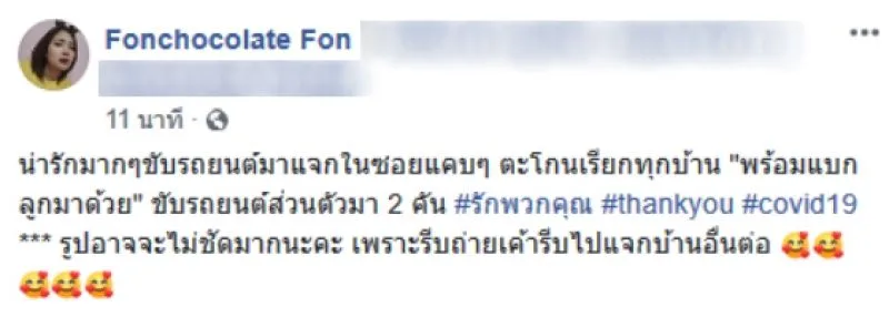 เมื่อวันที่ 26 เมษายน ผู้ใช้เฟสบุ๊คชื่อว่า Fonchocolate Fon ได้โพสต์ข้อความระบุว่า น่ารักมากๆขับรถยนต์มาแจกในซอยแคบๆ ตะโกนเรียกทุกบ้าน พร้อมแบกบุตรตัวน้อยมาด้วย ขับรถยนต์ส่วนตัวมา 2 คัน รักพวกคุณ thankyou co vid รูปอาจจะไม่ชัดมากนะคะ เพราะรีบถ่ายเขารีบไปแจกบ้านอื่นต่อ
