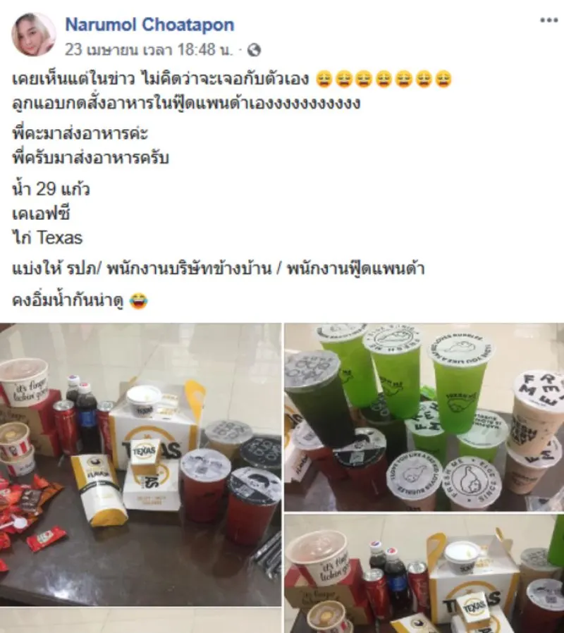 เรียกได้ว่าเป็นอีกหนึ่งเรื่องราว ที่เรียกเสียงฮาในโซเชียล เมื่อวันที่ 23 เมษายน ที่ผ่านมา ผู้ใช้เฟซบุ๊กชื่อ Narumol Choatapon ได้มีการโพสต์เรื่องราวสุดพีค หลังจากที่จู่ๆ ก็มีพนักงานส่งอาหาร มาเคาะเรียกที่หน้าบ้าน พร้อมกับอาหารและเครื่องดื่มจำนวนมาก ทำเอาเจ้าตัวถึงกับงงว่าไปสั่งอาหารตั้งแต่เมื่อไหร่ ก่อนที่จะมารู้ทีหลังว่า สาวน้อยที่บ้านแอบกดสั่งมา แต่เนื่องจากอาหารมาเยอะมาก จึงได้นำไปแบ่งเป็นน้ำใจ ให้กับพนักงานส่งอาหาร รปภ และเพื่อนบ้าน