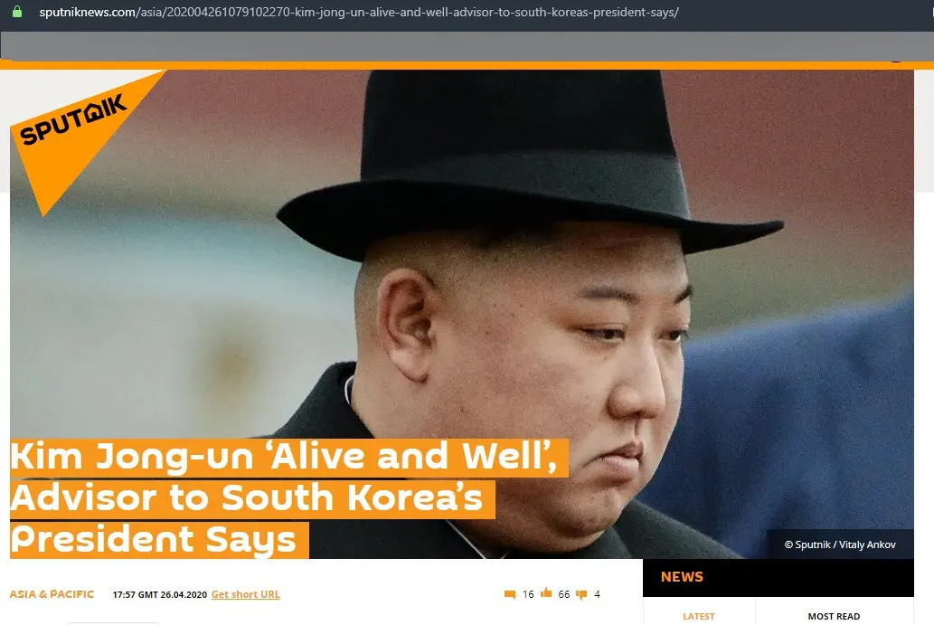 https://sputniknews.com/asia/202004261079102270-kim-jong-un-alive-and-well-advisor-to-south-koreas-president-says/?fbclid=IwAR3LvyIbRG9iXtp2ya8UQWcoTEr9cIDfQLLjUATc8OcW77Ds21XUhWOaha4