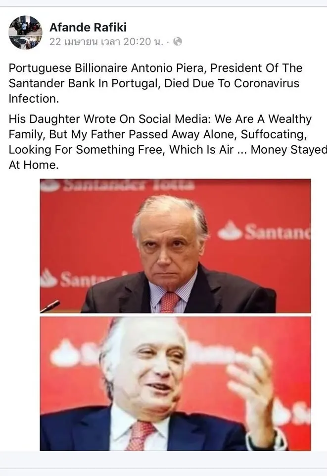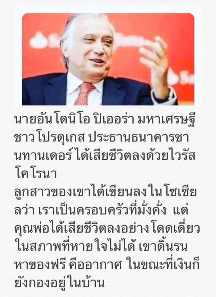 นายอันโตนิ โอปิเออร่า ประธานธนาคารซานฮานเดอร์ มหาเศรษฐีชาวโปรตุเกส เสียชีวิตจากการ ติดเชื้อไวรัสโคโรนาสายพันธุ์ใหม่ หรือ covid-19 เมื่อวันที่ 18 มีนาคม 2020