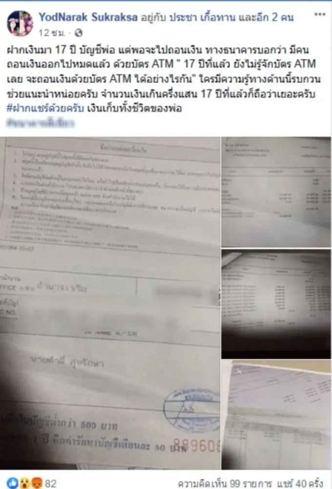 เรียกได้ว่าเป็นอีกหนึ่งเรื่องราวที่โซเชียลเข้ามาแสดงความเห็นกันเป็นจำนวนมาก หลังมีผู้ใช้เฟสบุ๊คชื่อ YodNarak Sukraksa ได้ออกมาโพสต์เรื่องราวหลังไปถอนเงินให้คุณพ่อ พร้อมทั้งได้ระบุข้อความว่า