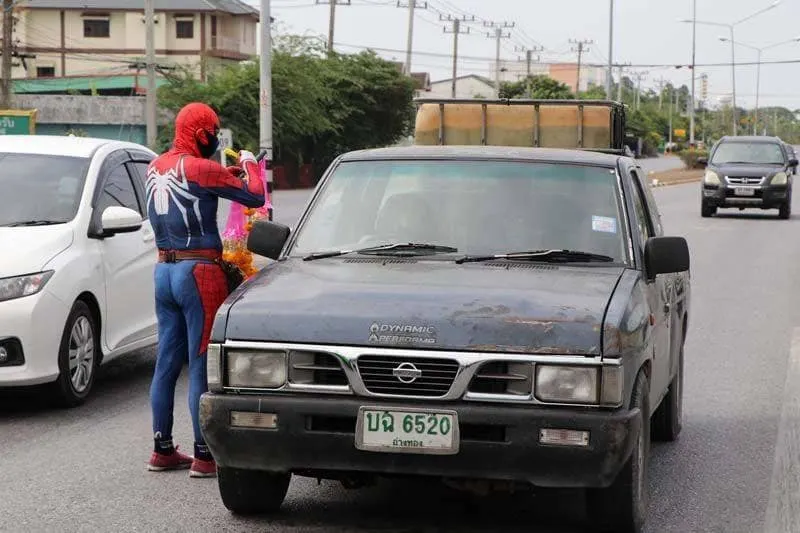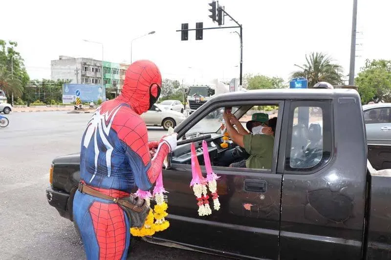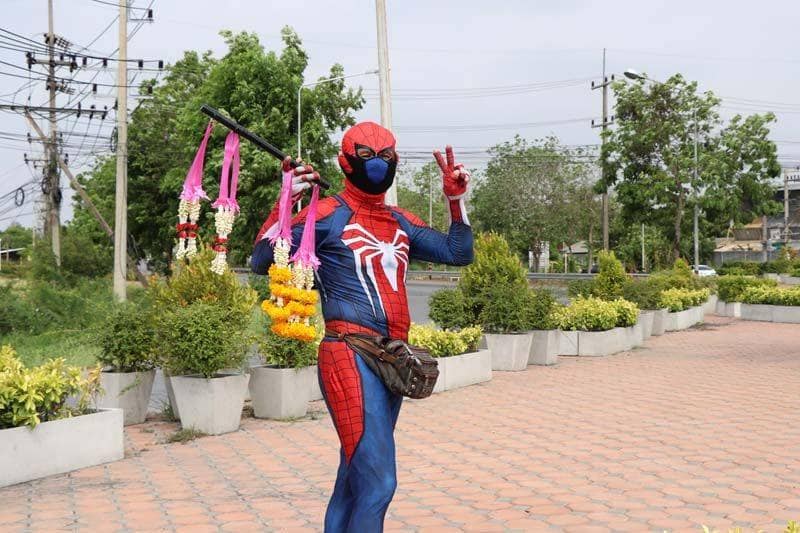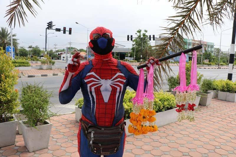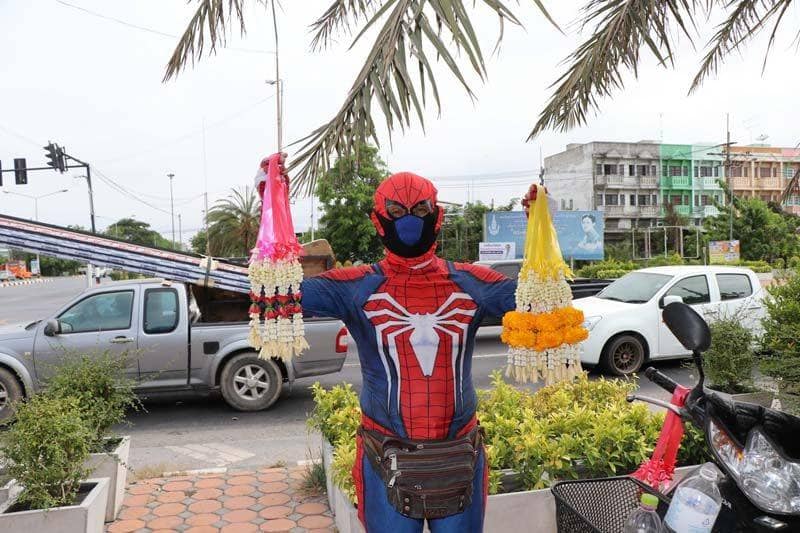วันที่ 25 เมษายน 2563 ผู้สื่อข่าวรายงาน ที่บริเวณสี่แยกไฟแดงเลี่ยงเมืองโพสะ ตำบลโพสะ อำเภอเมือง จังหวัดอ่างทอง พบหนุ่มใหญ่แต่งตัวสไปเดอร์แมน โผล่ออกมาขายพวงมาลัยที่บริเวณกลางสี่แยกไฟแดง หลังจากหายหน้าหายตา หยุดขายพวงมาลัยไปนาน ตั้งแต่ไวรัสโคโรนา โควิด-19 ได้เกิดการระบาด และในช่วงนี้ได้กลับออกมา แต่งชุดสไปรเดอร์แมนขายพวงมาลัยอีกครั้ง สร้างสีสันสร้างรอยยิ้มให้แก่ชาวบ้านที่ใช้เส้นทาง
