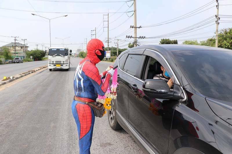 "สไปเดอร์แมน"มาแล้วโผล่กลางแยกไฟแดง หลังหยุดขายพวงมาลัยไปนาน เก็บตัวอยู่บ้านหยุดเชื้อเพื่อชาติ