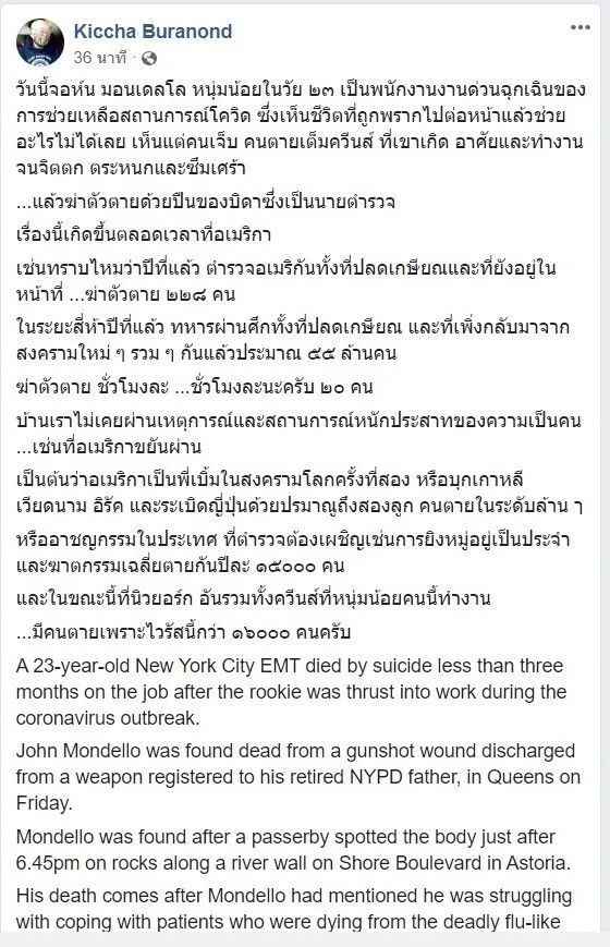 ล่าสุดวันนี้(27เม.ย.63) กิจจา บุรานนท์ อดีตคอลัมนิสต์ นิตยสาร ดิฉัน พลอยแกมเพชร ซึ่งอาศัยในนิวยอร์ก สหรัฐอเมริกา ได้โพสต์ข้อความผ่านเฟซบุ๊กถึงสถานการณ์แพร่ระบาดของโควิด-19 ที่น่าสนใจเป็นอย่างมาก โดยเฉพาะประเด็นของการทำหน้าที่ของเจ้าหน้าที่ และมีเรื่องของการฆ่าตัวตายเข้ามาด้วยว่า