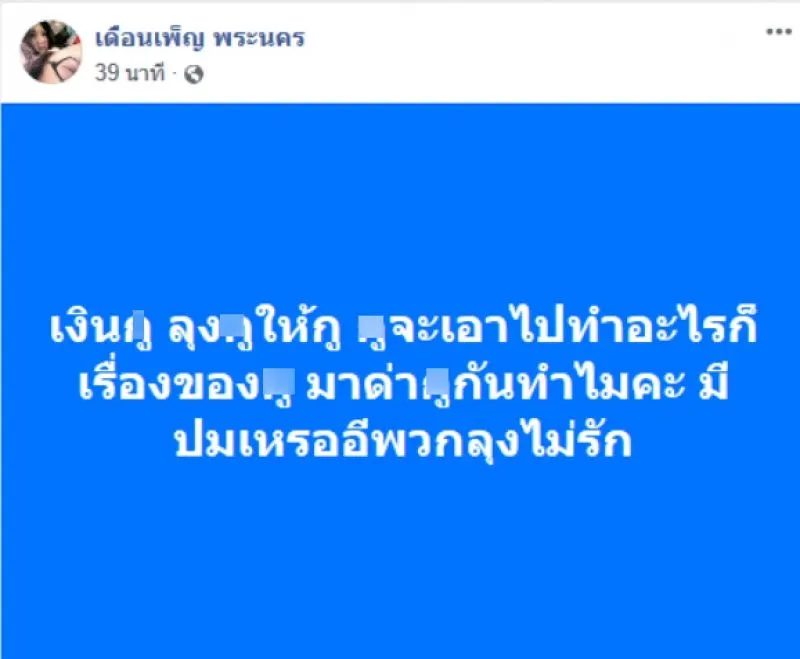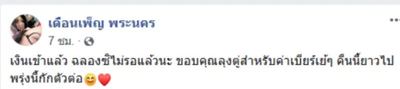 ล่าสุดโผลอีกรายสำหรับหญิงสาวรายหนึ่ง ใช้ชื่อเฟสว่า เดือนเพ็ญ พระนคร ไดโพสต์ข้อความระบุว่า เงินเข้าแล้ว ฉลองซิไม่รอแล้วนะ ขอบคุณลุงตู่สำหรับค่าเครื่องดื่มเย้ๆ คืนนี้ยาวไปพรุ่งนี้กักตัวต่อ