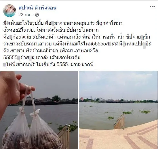 เป็นอีกหนึ่งโพสต์ที่ได้รับความสนใจอย่างมากในโลกออนไลน์ เมื่อผู้ใช้เฟซบุ๊กที่ใช้ชื่อ สุปาณี ลำพึงวอน ได้ออกมาโพสต์ข้อความผ่านทางเฟซบุ๊กส่วนตัว เล่ารายละเอียดหลังจากที่ตนเองได้รับสายจากลุกค้าให้ไปส่งหอยให้ถึงที่ แต่ได้เห็นความพยายามของลูกค้าถึงกับให้กินฟรี โดยจากโพสต์นั้นได้ระบุว่า