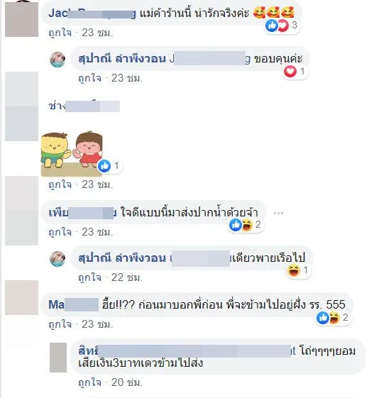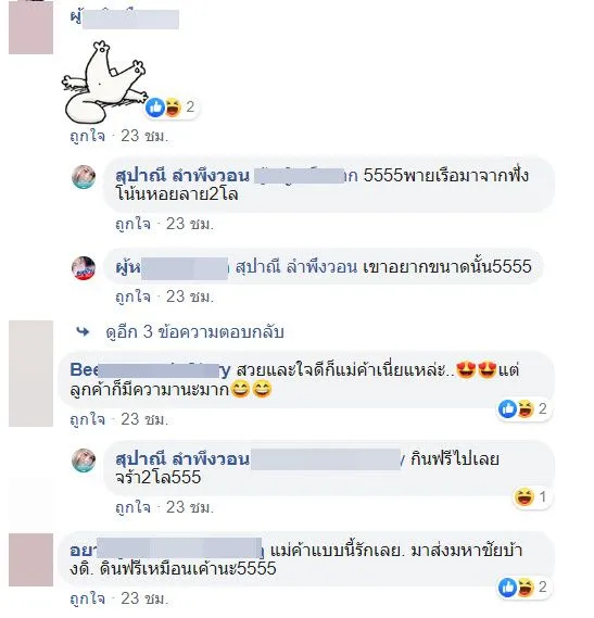 โดยจากโพสต์นี้ก็มีชาวเน็ตหลายท่านเข้ามาแสดงความคิดเห็นกันอย่างมากมาย พร้อมทั้งชื่นชมในความใจดีของแม่ค้า ที่เห็นลูกค้าพายเรือข้ามฝังมารับของ แล้วให้กินฟรี ทั้งมาส่งให้ให้กินฟรีอีกใจดีมากๆ