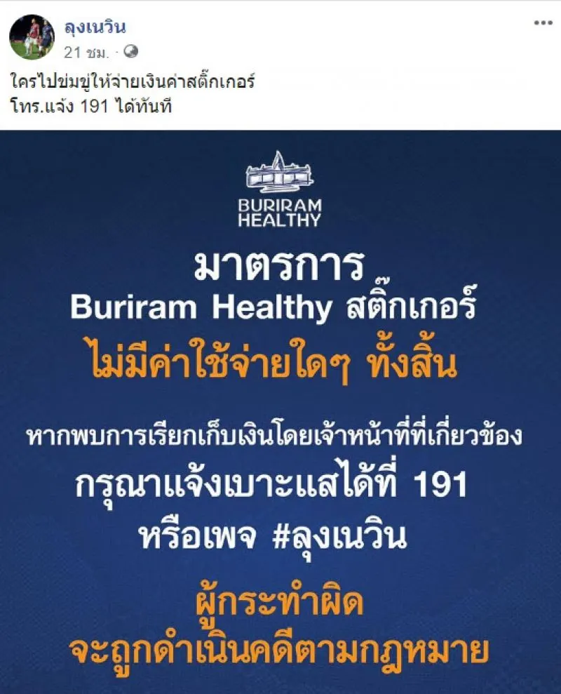 ล่าสุด เนวิน ชิดชอบ ประธานบริหารสโมสรฟุตบอลบุรีรัมย์ ยูไนเต็ด ได้โพสต์ข้อความลงในเฟซบุ๊กส่วนตัวเกี่ยวกับกรณีดังกล่าวว่า ใครไปข่มขู่ให้จ่ายเงินค่าสติ๊กเกอร์ โทร.แจ้ง 191 ได้ทันที ซึ่งในข้อความภาพนั้นระบุว่า มาตรการ Buriram Healthy สติ๊กเกอร์ไม่มีค่าใช้จ่ายใดๆทั้งสิ้นหากพบการเรียกเก็บเงินโดยเจ้าหน้าที่ที่เกี่ยวข้องกรุณาแจ้งเบาะแสได้ที่ 191 หรือเพจลุงเนวินผู้กระทำผิดจะถูกดำเนินคดีตามกฎหมาย