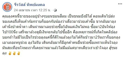 เมื่อวันที่ 24 เมษายน 2563 ที่ผ่านมา ผู้ใช้เฟซบุ๊ก ชื่อ จีรวัสส์ ทิพย์มงคล ได้ออกมาเผยแพร่โพสต์ ซึ่งเป็นเรื่องราวสุดเศร้าใจ พี่น้องประชาชนชาวไทยได้รับผลกระทบจากสถานการณ์การแพร่ระบาดของเชื้อไวรัสโควิด-19 อย่างมากมาย ทั้งตกงาน ถูกสั่งให้ปิดร้านชั่วคราว พ่อค้า แม่ค้า ขายของลำบาก ทำให้รายได้ลดลง บางครอบครัวถึงกับไม่มีข้าวกิน เหมือนดั่งคุณลุงขายขนมปัง ท่านนี้ เอ่ยปากขอวอนให้ผู้โพสต์ช่วยซื้อขนมปัง เพราะแกไม่ได้กินข้าวมา 2 วัน ผู้โพสต์ไม่รอช้า ทำธุระเสร็จกลับมาช่วยอุดหนุนคุณลุงทันที คุณลุงซึ้งน้ำใจ ยกมือไหว้ทั้งน้ำตา โดยผู้ใช้เฟซบุ๊กดังกล่าว ได้ระบุข้อความเอาไว้ว่า