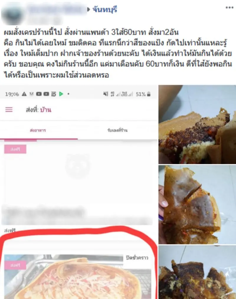 ผู้ใช้เฟซบุ๊กท่านหนึ่ง ได้มีการโพสต์ภาพเครป ที่สั่งมาจากร้านในห้างแห่งหนึ่ง จังหวัดจันทบุรี ผ่านแอพสั่งอาหารชื่อดัง ในราคา 60 บาท แต่ทว่าเมื่อเครปมาถึง กับพบว่าเครปที่สั่งนั้น ไหม้จนทานไม่ได้ ทานเข้าไปถึงกับขม จึงได้นำมาโพสต์เตือนเพื่อให้ทางร้านค้า ปรับปรุงแก้ไข เพราะไม่ควรส่งมาให้ผู้บริโภคตั้งแต่แรก