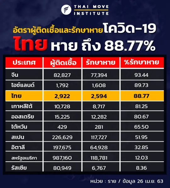 เทียบจะๆ อัตราการรักษาโควิด-19หาย ไทย88.77% สูงมากอันดับต้นๆของโลก ขณะที่USAแค่12.03% หมอไทยไม่แพ้ชาติใดในโลก
