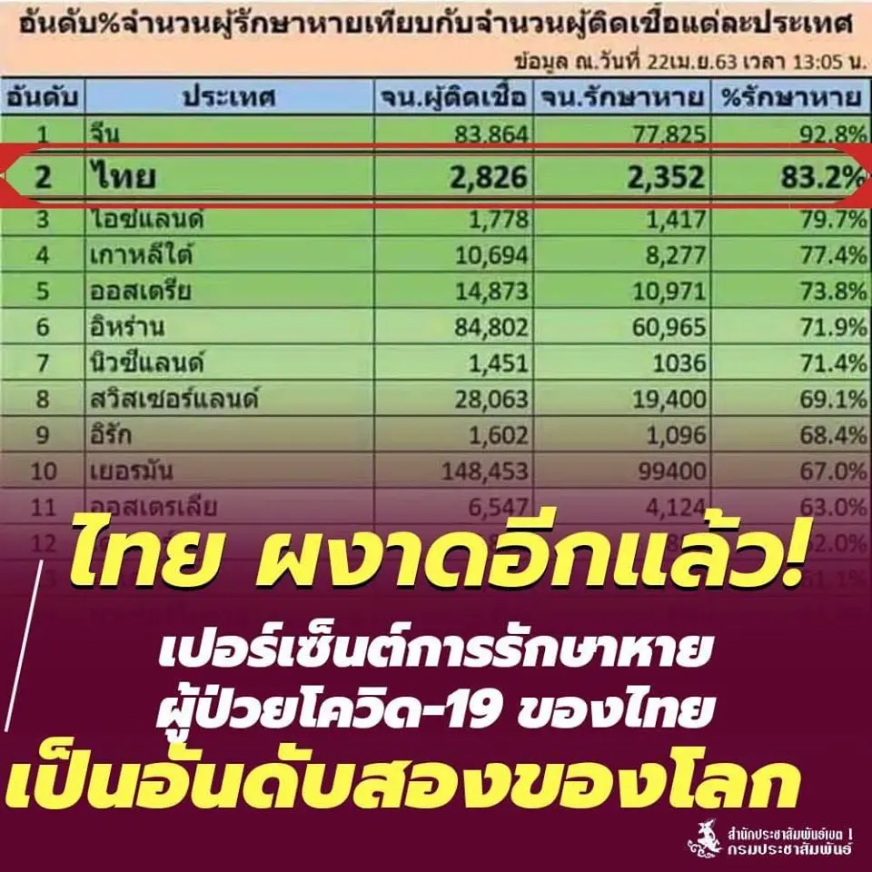 สำนักข่าวญี่ปุ่นหลายสำนักรายงานว่าประเทศไทยสามารถรักษาผู้ป่วยติดเชื้อไวรัสโควิดหายดีสูงถึง 87% นับเป็นเปอร์เซ็นต์ที่สูงมากอันดับต้นๆของโลกเลยทีเดียว