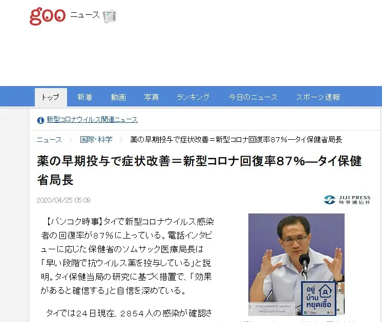 薬の早期投与で症状改善 タイ https://news.goo.ne.jp/article/jiji/world/jiji-200425X402.html