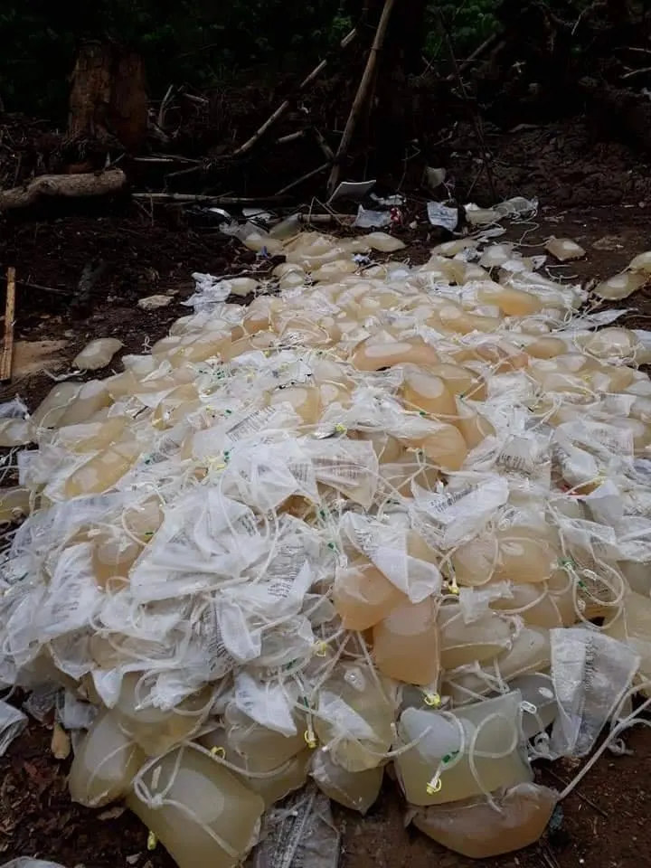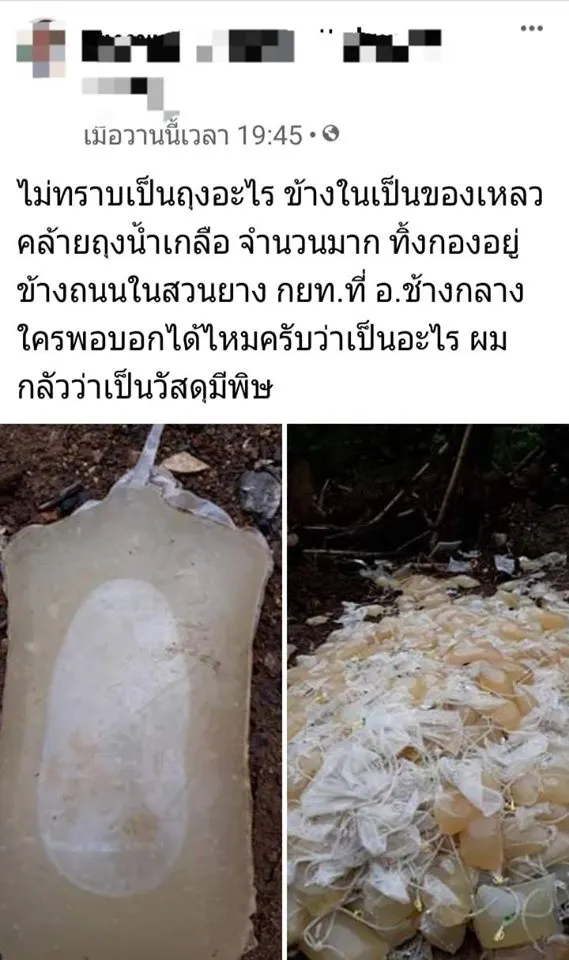 ไม่ทราบเป็นถุงอะไร ข้างในเป็นของเหลวคล้ายถุงน้ำเกลือ จำนวนมาก ทิ้งกองอยู่ข้างถนนในสวนยาง กยท.ที่ อ.ช้างกลาง ใครพอบอกได้ไหมครับว่าเป็นอะไร ผมกลัวว่าเป็นวัสดุมีพิษ