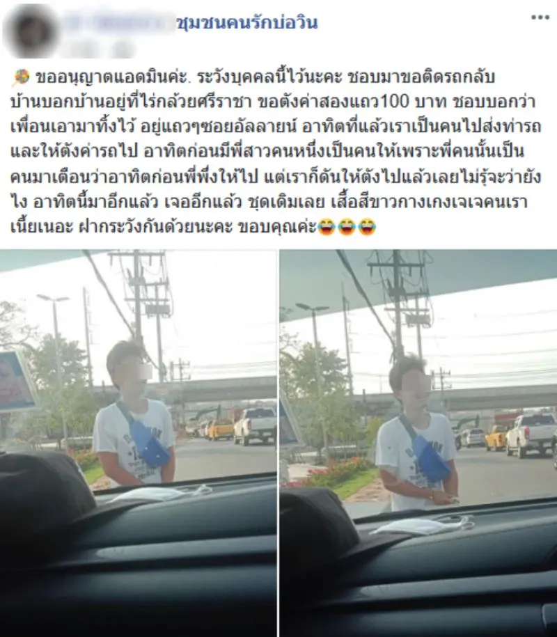 วันที่ 28 เมษายน ผู้ใช้เฟซบุ๊กท่านหนึ่ง ได้มีการโพสต์เตือน หลังจากที่เจอชายรายหนึ่ง มายืนขอความช่วยเหลืออยู่ข้างทาง แต่ทว่าชายรายนี้ กลับมีพฤติกรรมเข้าข่ายเป็นมิจฉาชีพขออนุญาต...ค่ะ ระวังบุคคลนี้ไว้นะคะ ชอบมาขอติดรถกลับบ้านบอกบ้านอยู่ที่ไร่กล้วยศรีราชา ขอตังค่าสองแถว100 บาท ชอบบอกว่าเพื่อนเอามาทิ้งไว้ อยู่แถวๆซอยอัลลายน์ อาทิตที่แล้วเราเป็นคนไปส่งท่ารถและให้ตังค่ารถไป อาทิตก่อนมีพี่สาวคนหนึ่งเป็นคนให้เพราะพี่คนนั้นเป็นคนมาเตือนว่าอาทิตก่อนพี่พึ่งให้ไป แต่เราก็ดันให้ตังไปแล้วเลยไม่รุ้จะว่ายังไง อาทิตนี้มาอีกแล้ว เจออีกแล้ว ชุดเดิมเลย เสื้อสีขาวกางเกงเจเจคนเราเนี้ยเนอะ ฝากระวังกันด้วยนะคะ ขอบคุณค่ะ