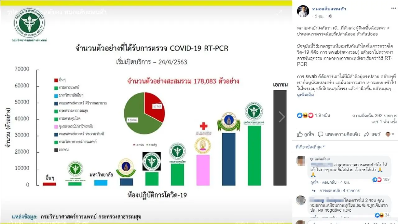 โดยเพจเฟซบุ๊กชื่อดังอย่าง หมอแล็บแพนด้า ได้โพสต์ไขข้อข้องใจว่า "หลายคนยังสงสัยว่า เอ๊...ที่ตัวเลขผู้ติดเชื้อน้อยเพราะประเทศเราตรวจน้อยรึเปล่าน้อออ ตั๋วกันบ้อออ ปัจจุบันนี้วิธีมาตรฐานที่ยอมรับกันทั่วโลกในการตรวจโควิด-19 ก็คือ การ swab(สะ-หวอบ) แล้วเอาไปตรวจหาสารพันธุกรรม ภาษาทางการแพทย์เขาเรียกว่าวิธี RT-PCR การ swab ก็คือการเอาไม้ที่มีสำลีอยู่ตรงปลาย คล้ายๆที่เราปั่นหูนั่นแหละครับ แต่มันจะยาวมาก เขาจะแหย่เข้าไปในโพรงจมูกลึกไปจนสุดโพรง แล้วกำมือขึ้น แล้วหมุนๆ กำมือขึ้นโบกไปมา ไม่ใช่!!! 555555 เขาจะหมุนไม้ประมาณ 2-3 ครั้งเพื่อหวังจะกวาดให้ได้เจ้าเชื้อไวรัสติดสำลีมา จากนั้นก็จะให้เราอ้าปากและแหย่ไม้อีกอันไปที่ลำคอ แล้วก็เอาไม้เก็บใส่หลอดที่มีสารละลายอยู่ข้างใน แล้วเอาไปตรวจหาดีเอ็นเอของไวรัส จำได้มั้ยที่เราเคยให้ความสนใจเรื่องหวยน่ะ ที่บางคนรีบเอาล็อตเตอรี่มาเลีย หวังจะให้ดีเอ็นเอติดอยู่นั่นแหละ 55555 เหมือนกันๆ แต่อันนี้เราจะหาดีเอ็นเอของเชื้อโรคที่มันเกาะอยู่ในโพรงจมูกและลำคอของเรา ขอให้ swab โดนตัวมันนิดเดียวแค่นั้นแหละ เราก็ตรวจหาดีเอ็นเอของมันได้แล้ว ซึ่งข้อมูล ณ วันที่ 24 เมษายน 2563 เราตรวจไปแล้ว 178,083 ตัวอย่าง และจะตรวจได้มากขึ้นไปอีก เพราะตอนนี้มีห้องแล็บที่ได้รับการรับรองจากกรมวิทยาศาสตร์การแพทย์มีตั้ง 112 แห่งทั่วประเทศ เดี๋ยวคงตรวจกันให้รึ่ม เพราะฉะนั้น ตัวเลขติดเชื้อ 9 ราย เมื่อวาน จึงน่าดีใจและถือว่าน้อยมากๆครับ ขอให้อย่าประมาท และระลึกไว้เสมอว่า เจอไวรัสคงเป็นไข้เจอคนที่ใช่คงเป็นเธอ"