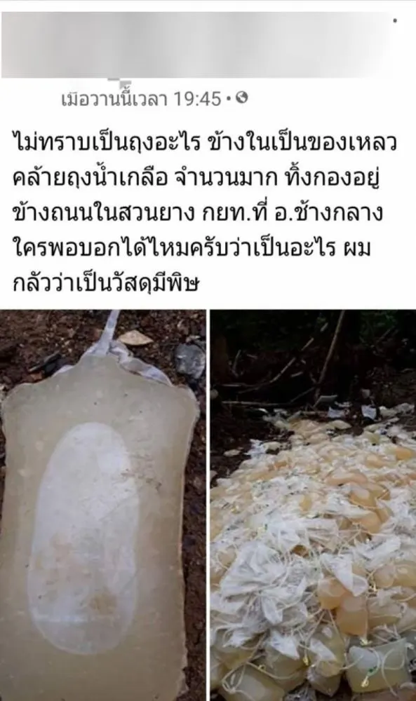 กลายเป็นอีกเรื่องราวที่เป็นประเด็นในโลกโซเชียล เมื่อได้มีผู้ใช้เฟซบุ๊ครายหนึ่ง ได้โพสต์ภาพของถุงปริศนาที่มีลักษณะคล้ายถุงน้ำเกลือ ถูกวางทิ้งไว้เกลื่อนเต็มข้างทางภายในสวนยาง ซึ่งหนุ่มคนดังกล่าวได้โพสตืภาพพร้อมระบุข้อความว่า