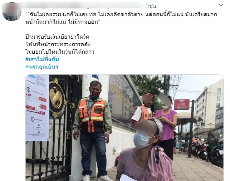 ชาวเน็ตทวิตภาพสุดสลดใจ มีมาอีกแล้ว ที่ บ่ายวันนี้ มีสาวท่านหนึ่ง นอนขวางประตูทางเข้าออกประตู 4 กระทรวงการคลัง เพื่อร้องเงินเยียวยา 5 พัน "เราไม่ทิ้งกัน’ "ขอพบ ‘ลวรณ-อุตตม’ ของเจ้าหน้าที่