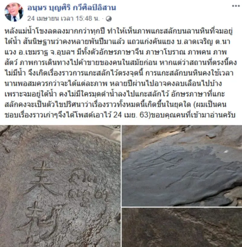 หลังแม่น้ำโขงลดลงมากกว่าทุกปี ทำให้เห็นภาพแกะสลักบนลานหินที่ อยู่ใต้น้ำ สันนิษฐานว่าคงหลายพันปีมาแล้ว แถวแก่งคันแยง บ.ลาดเจริญ ต.นาแวง อ.เขมราฐ จ.อุบลฯ มีทั้งตัวอักษรภาษาจีน ภาษาโบราณ ภาพคน ภาพสัตว์ ภาพการเดินทางไปค้าขายของคนในสมัยก่อน หากแต่ว่าสถานที่ตรงนี้คงไม่มีน้ำ จึงเกิดเรื่องราวการแกะสลักไว้ตรงจุดนี้ การแกะสลักบนหินคงใช้เวลานานพอสมควรกว่าจะได้แต่ละภาพ หลายปีผ่านไปอาจคงลบเลือนไปบ้างเพราะ อยู่ใต้น้ำ คงไม่มีใครมุดดำน้ำลงไปแกะสลักไว้ อักษรภาษาที่แกะสลักคงจะเป็นตัวไขปริศนาว่าเรื่องราวทั้งหมดนี้เกิดขึ้นในยุคใด (ผมเป็นคนชอบเรื่องราวเก่าๆจึงได้โพสต์เอาไว้ 24 เมย. 63)ขอบคุณคนที่เข้ามาอ่านครับ
