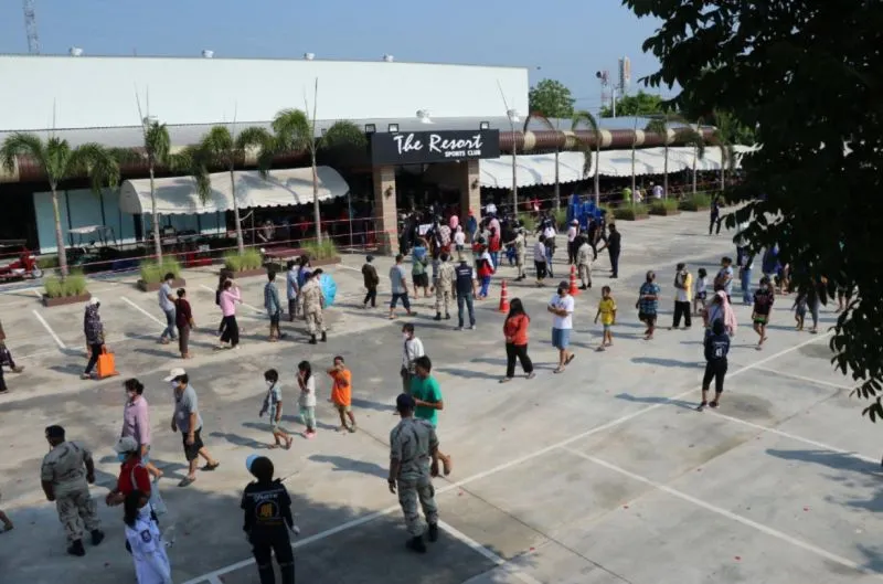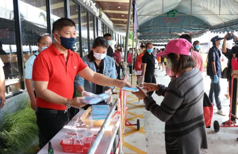 โดยหลังที่มีการโพสต์ผ่านเฟซบุ๊กส่วนตัว มีประชาชนทราบข่าวได้ต่อแถวยาวจำนวนมาก ซึ่งมีเจ้าหน้าที่สาธารณสุข โดยวันนี้ได้ประสานนายนพรัตน์ นพรัตน์ รัตนพานิช นายอำเภอโพธาราม พ.ต.อ.สมมาตร จันทรรัตน์ ผกก.สภ.โพธาราม และเจ้าหน้าที่ตำรวจ เจ้าหน้าที่ฝ่ายปกครอง อสม. หน่วยกู้ชีพกู้ภัยสว่างราชบุรีคอยดูแลจัดระเบียบ คัดกรองประชาชน และตรวจวัดไข้ คัดกรอง และจัดให้เว้นระยะห่าง โดยเจ้าของงานแจ้งว่าจะปิดประตูในเวลา 11.00 น. เป็นการสิ้นสุดการแจก ซึ่งมีประชาชนเข้าไปยืนต่อแถวยาว เข้าไปในสนามฟุตบอลโดยการแจกจะแบ่งออกเป็น 2 แถว เพื่อเร่งระบายประชาชนให้เร็วขึ้น เมื่อรับเงินเสร็จก็จะได้หน้ากากอนามัยคนละ 1 ชิ้น จากนั้นจะได้ข้าวสารและปลากระป๋องแล้วเดินกลับ
