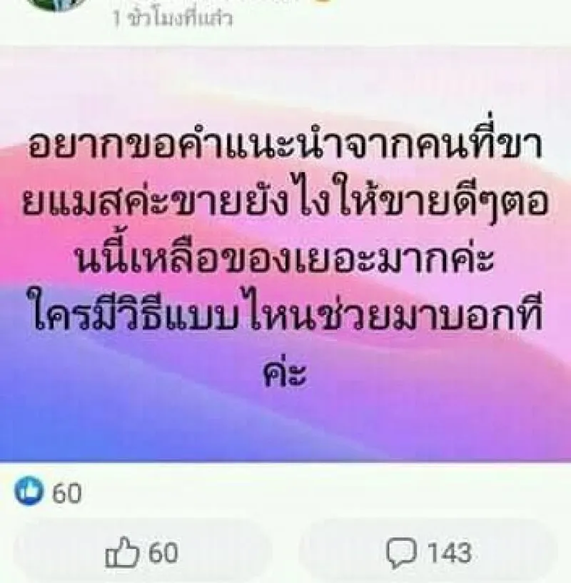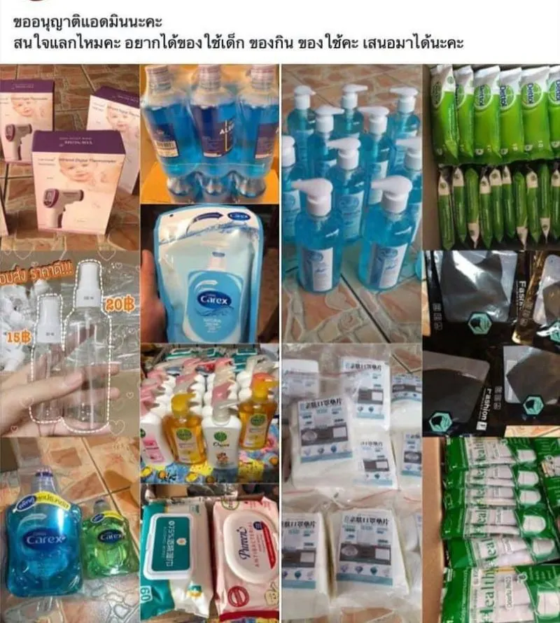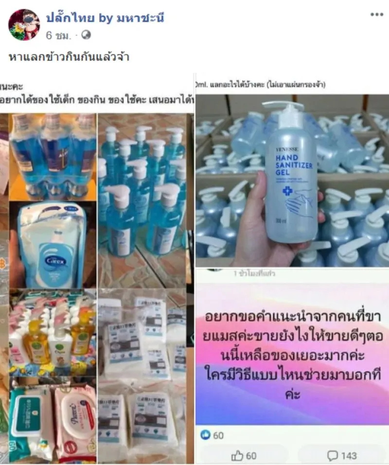29 เมษายน 2563 ผู้สื่อข่าวรายงานว่า ได้มีผู้ใช้เพจเฟซบุ๊กรายหนึ่งชื่อ ปลั๊กไทย by มหาชะนี ซึ่งได้โพสต์ภาพของแม่ค้ารายหนึ่งซึ่งโพสต์ขายเจลล้างมือ โดยระบุข้อความว่า หาแลกข้าวกินกันแล้วจ้า